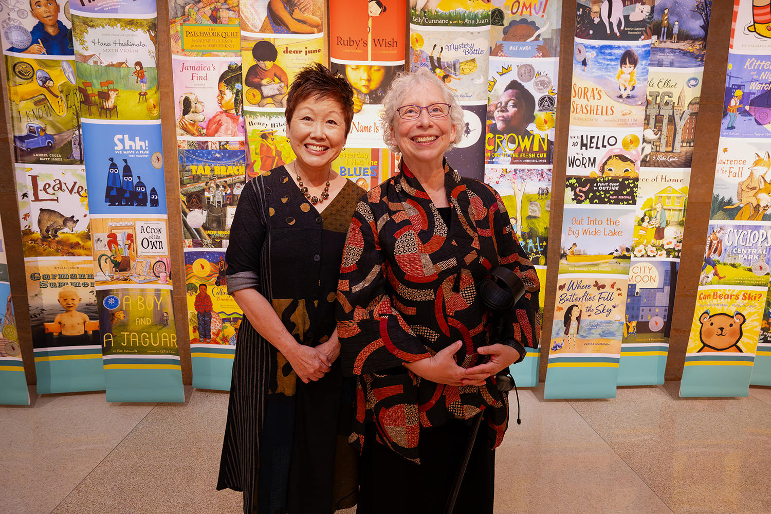 - Lisa Yee, 2024 Kerlan Award winner, and Lisa Von Drasek, Miranker Family Curatorial Chair of the Kerlan Collection, stand in front of the Kerlan’s upcoming Journey to Joy exhibit for the 2024 Kerlan Award ceremony on Oct. 22, 2024. (Photo/Craig Bares)