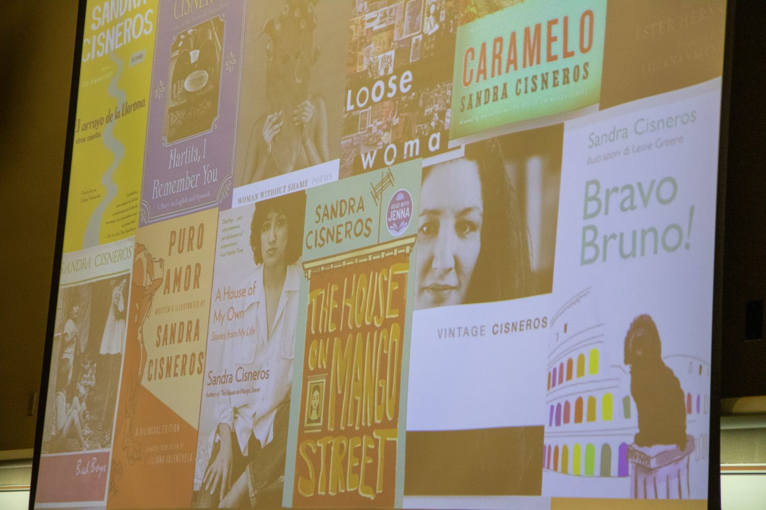 - A digital screen featured a collage of book covers from books written by author Sandra Cisneros at the event Entre Comadres: A conversation with author Sandra Cisneros on Monday, Oct. 14, 2024 at Walter Library. (Photo/K Carmody-McIntosh)