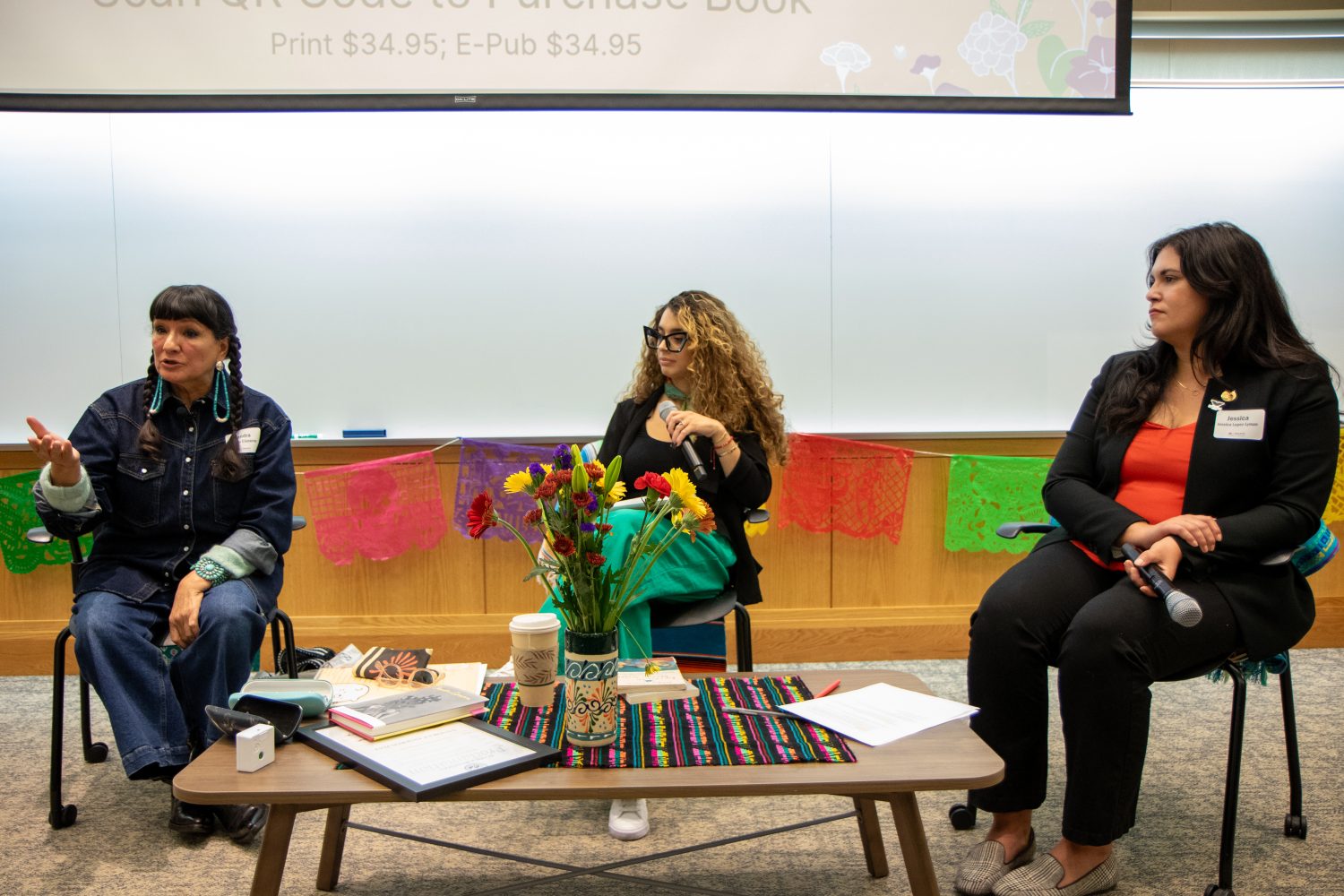 - Author Sandra Cisneros spoke in conversation with Paloma Barraza, History, Iberian & Latin American Studies Librarian, and Dr. Jessica Lopez-Lyman, Chicano and Latino Studies, at the event Entre Comadres: A conversation with author Sandra Cisneros on Monday, Oct. 14, 2024 at Walter Library. (Photo/K Carmody-McIntosh)