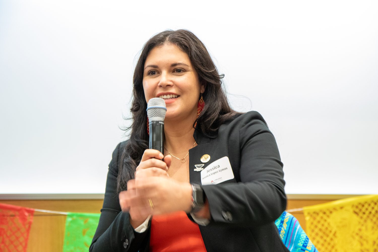 - Dr. Jessica Lopez-Lyman took questions from the audience during the Q&A at the event Entre Comadres: A conversation with author Sandra Cisneros on Monday, Oct. 14, 2024 at Walter Library. (Photo/K Carmody-McIntosh)
