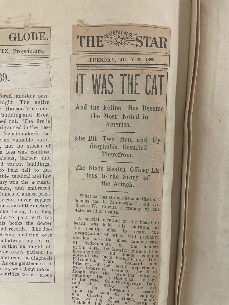Selected materials from MPHA records were on display alongside artifacts from the Wangensteen Historical Library of Biology and Medicine and the School of Public Health records within the University Archives. An 1889 newspaper clipping declaring “It Was The Cat” that gave two people rabies (or “hydrophobia,” as it was known then) was on view alongside 1950s MPHA conference agendas and the first UMN class syllabus to include AIDS from 1986.