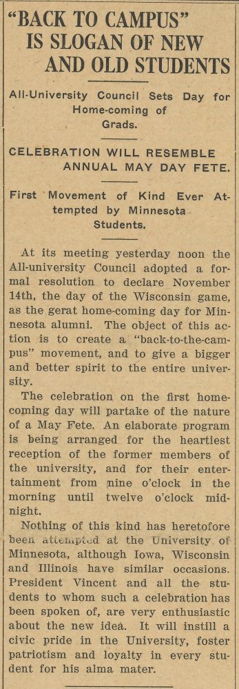 In the October 2, 1914 issue of The Minnesota Daily, it was announced that the All-University Council had adopted a resolution declaring November 14, 1914, as the “home-coming day for Minnesota alumni.” The initiative aimed to “create a ‘back-to-the-campus’ movement, and to give a bigger and better spirit to the entire University.” An elaborate program was planned in conjunction with the football game against Wisconsin and was met with enthusiasm by students and President George Edgar Vincent. The event sought to ‘instill civic pride in the University, and foster patriotism and loyalty in every student for his alma mater.’