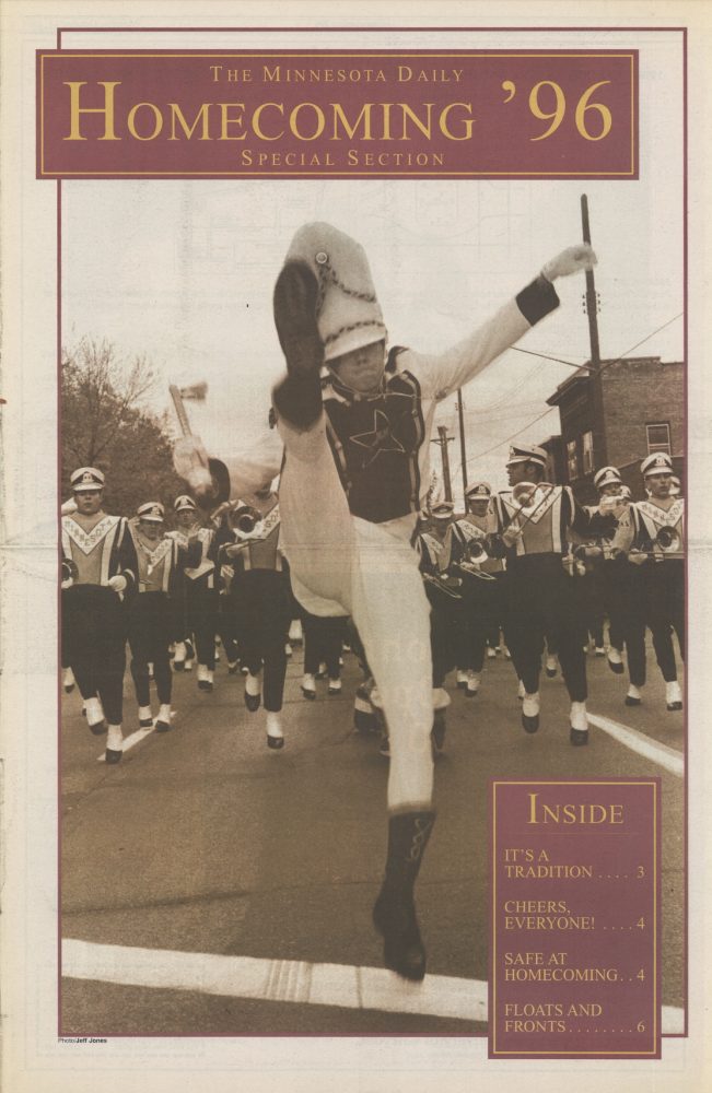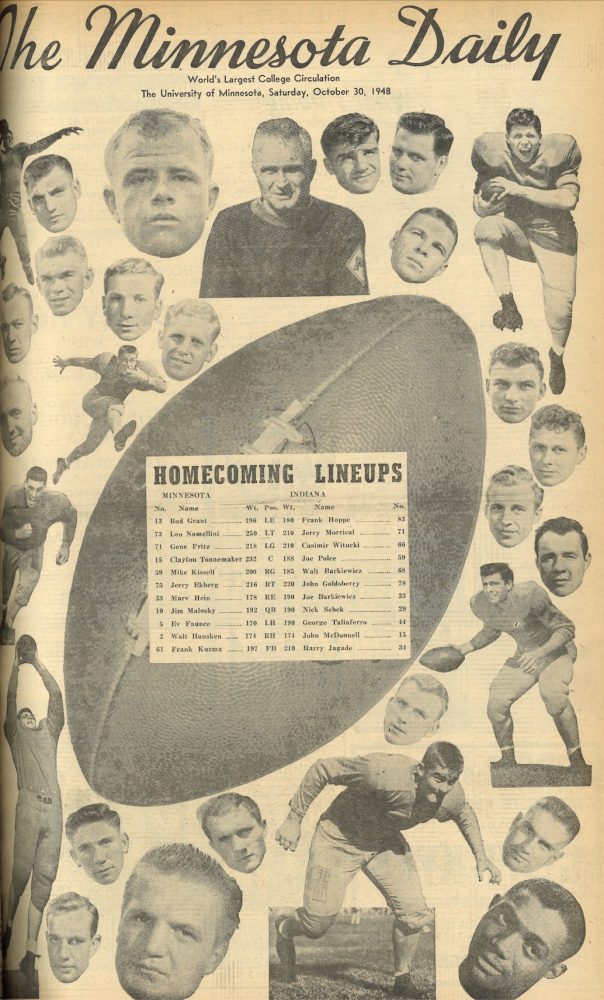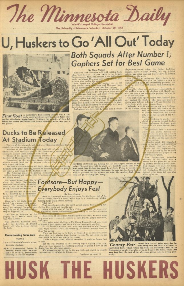 The first documented Homecoming edition of the Daily was printed and distributed on Saturday, November 13, 1915. It highlighted the convocation to open the football game, a review of the Gopher line-up, and a program for a concert and dance. Throughout both World Wars, the special Homecoming edition was published intermittently as circumstances allowed. But by 1948, greater emphasis was placed on the event, and the Daily’s accompanying issues began appearing on a more regular basis.