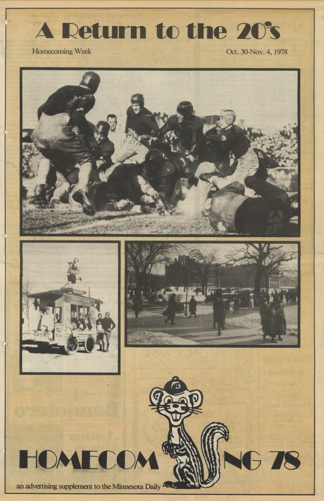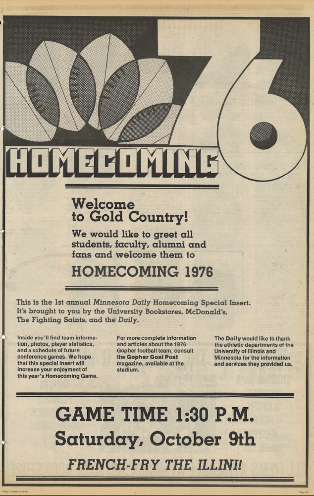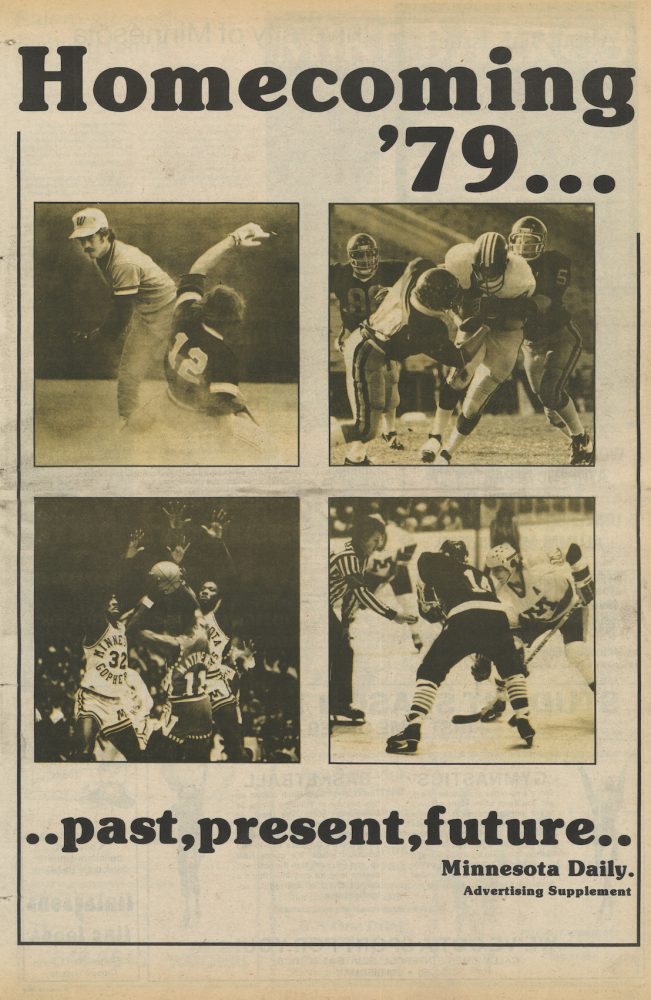 By the mid-1970s, the Daily began publishing its Homecoming edition as an advertising supplement to the regular issue. These inserts featured team information, player statistics, and photographs. Produced by the advertising department, these editions often incorporated articles from previous decades alongside promotions from local businesses supporting Gopher Homecoming activities.
