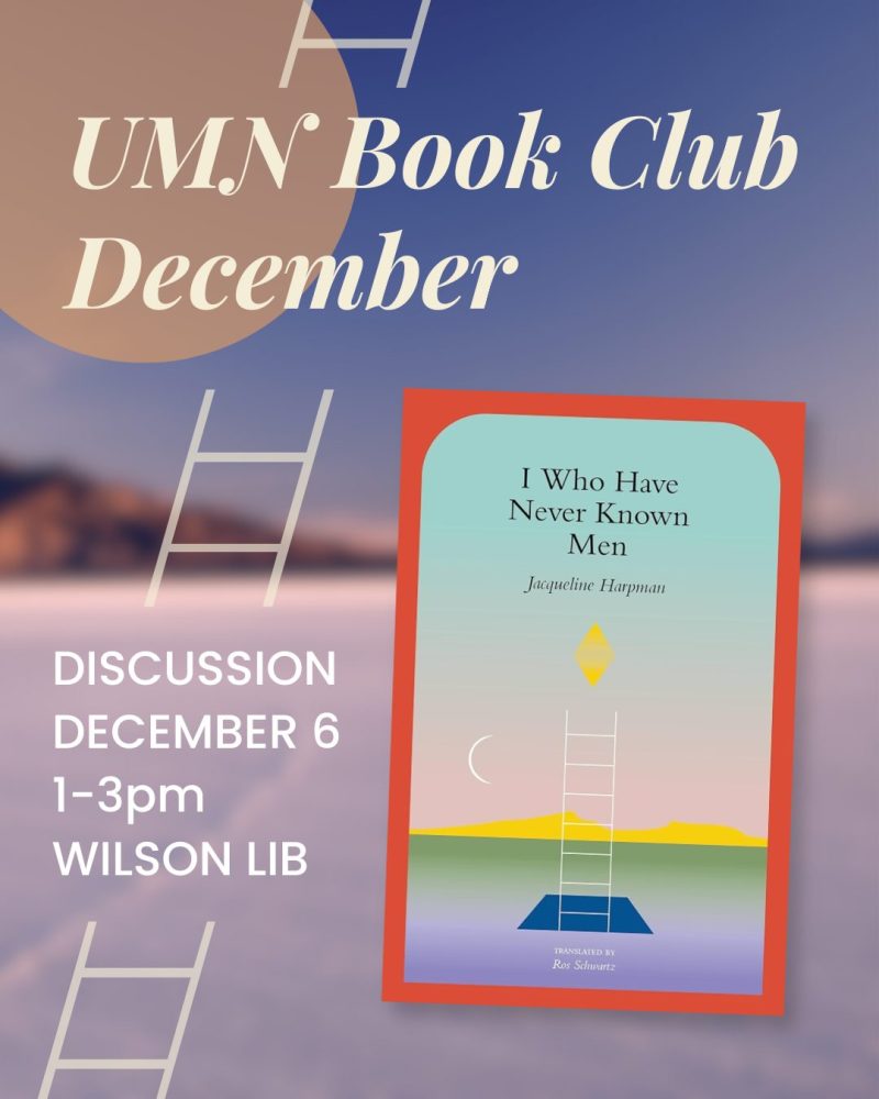Join the UMN Book Club for the our December book discussion, located in the Wilson Collaboration Studio on December 6th from 1 to 3PM. We will be discussing I Who Have Never Known Men by Jacqueline Harpman. All are welcome, even if you haven’t read the book!
